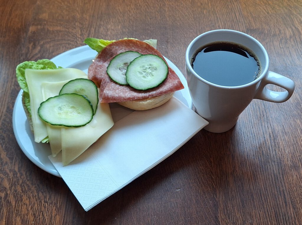 Belegtes Brötchen mit Becher Kaffee: 4,90 Euro