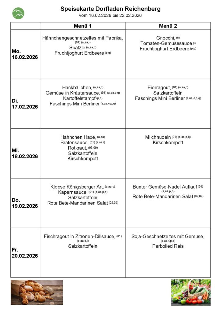 Die Küche im Lebenszentrum des DRK bietet montags bis freitags jeweils zwei verschiedene Tellergerichte inklusive Dessert zum Mittagessen an. Sie können diese bei uns vorbestellen. Wir servieren dann im Dorfladen oder Sie nehmen das Essen mit nach Hause. Unsere Mittagessenszeiten sind montags bis freitags von 10:30 Uhr bis 13:00 Uhr.